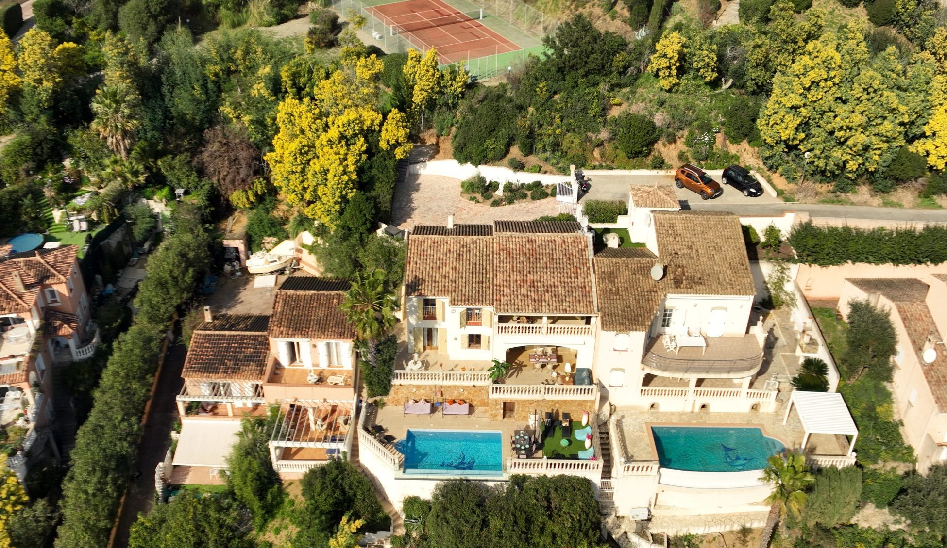 Villa pour 10 personnes avec vue exceptionnelle sur la mer et la vallée du Var. Piscine privée, tennis et accès à la plage à pied.